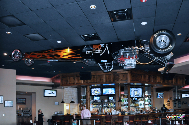 In the bar area, you will find a dragster hanging from
