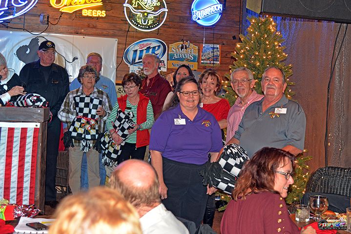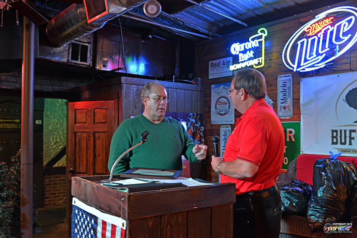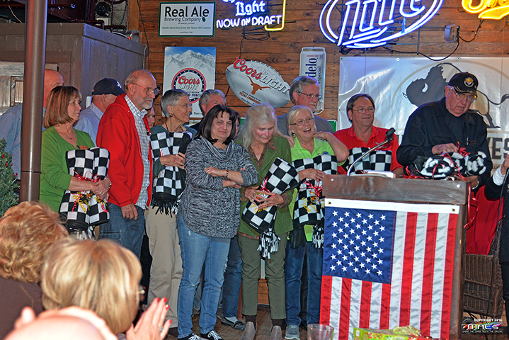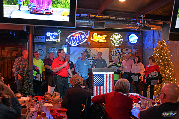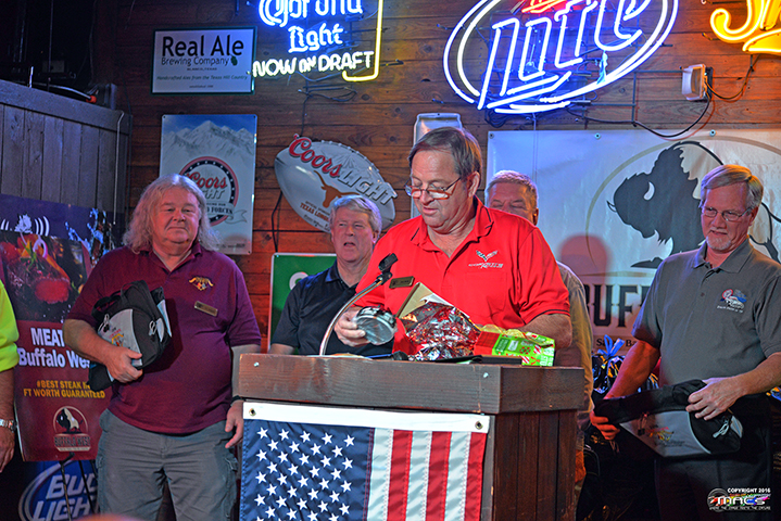 | | Jo Anne Smith (VP) was up next to present the Award of Appreciation to the 2016 President, Don Wells ...a nice set of customized coasters with their Shark Gray C7 Vette on them. | |